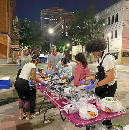 On Monday, June 12th, 2023 from 8 PM-12 AM, our founder, Catherine Van; future ambassador, Lea Rincon; and Historian, Kellen Wilson headed downtown to distribute 100 care packages, 90 granola bars, and 80 bottles of water to our homeless community on 1212 Prairie Street. The night starts with F.R.E.S.H. Project Houston giving out donated clothes, continues with Keep Moving Ministries leading worship and praise, peaks when Gals Who Give- Harris County prepare dinner plates, and closes with distributions by The Giving's June trio: Catherine, Lea, and Kellen!